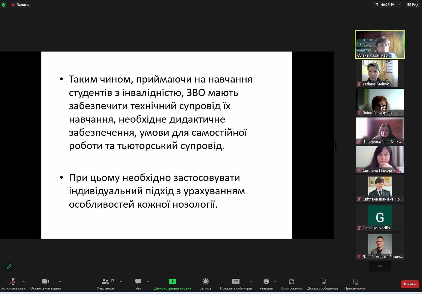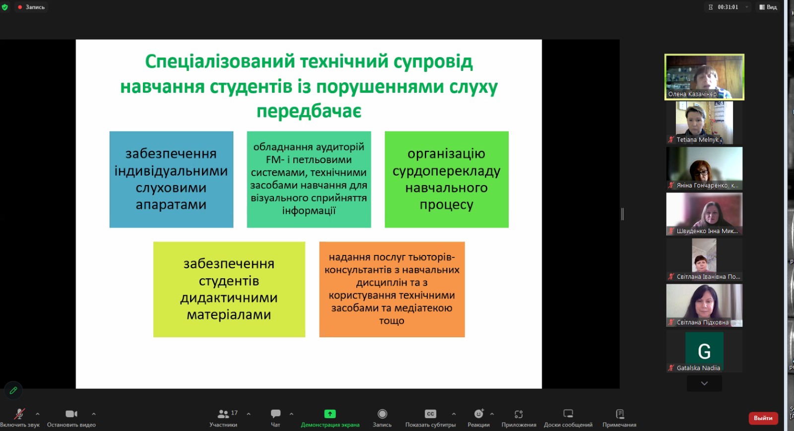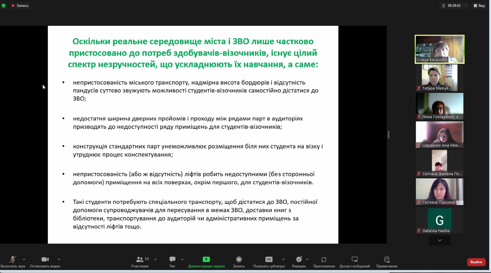 Зустріч була організована завідувачкою кафедри ландшафтної архітектури Харківський національний університет міського господарства імені О. М. Бекетова Яніною ГОНЧАРЕНКО для науково-педагогічних працівників, які здійснюють підготовку фахівців спеціальності садово-паркового господарства. У ході вебінару було порушено актуальні питання щодо можливостей адаптації освітнього процесу, специфіки підготовки здобувачів з інвалідністю, а також обговорено європейський і український досвід забезпечення інклюзивності у сфері вищої освіти.