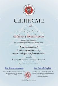 2024 р. – міжнародне стажування за програмою «Teaching and research in a contemporary university: trends, challenges, and future directions», Білостоцький Університет, Польща. З 12.08 по 20.092024р. в обсязі 180 кредитів, .