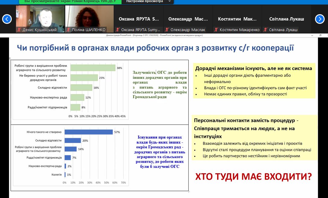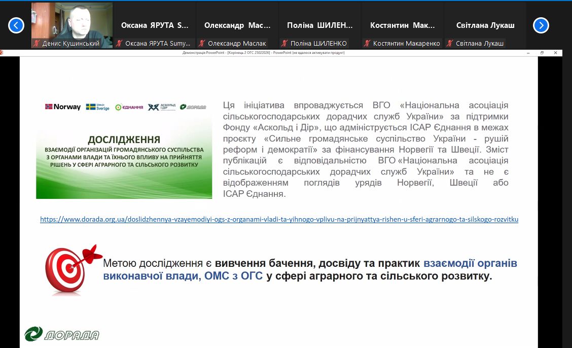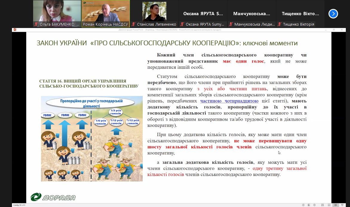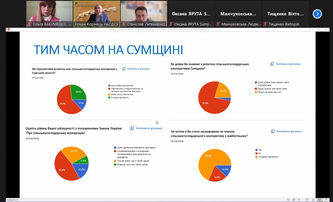 Учасники заходу розглянули актуальні питання організаційно-правового забезпечення сільськогосподарської кооперації та обговорили практичні аспекти її функціонування. Особливу увагу було приділено взаємодії влади, громад та аграрного бізнесу, визначенню проблемних аспектів розвитку кооперації на Сумщині та пошуку ефективних шляхів їх вирішення.