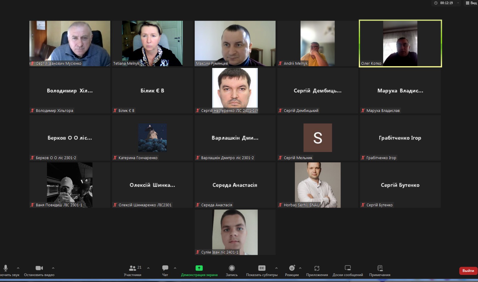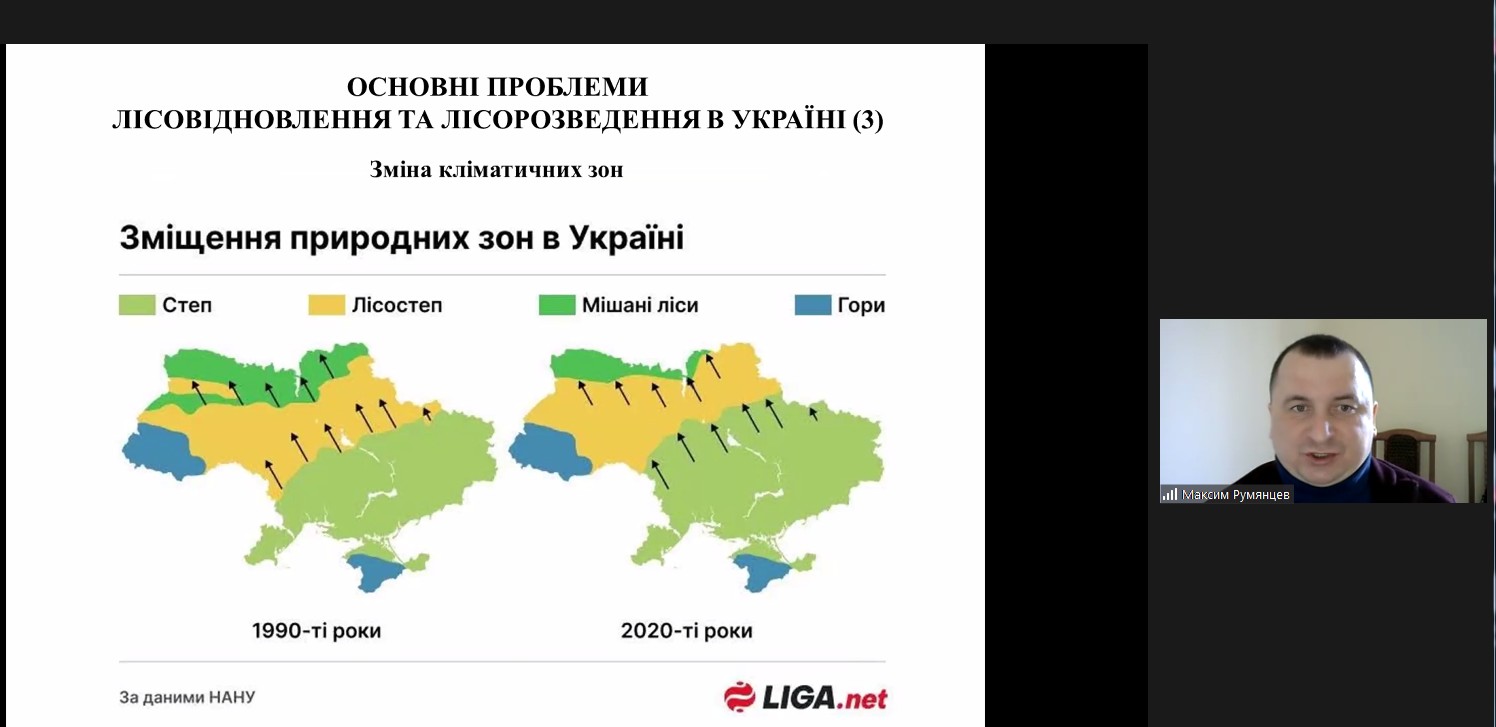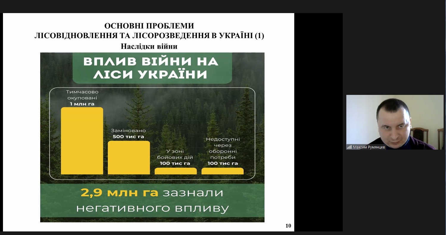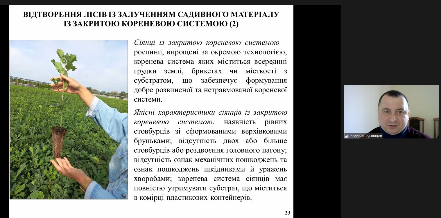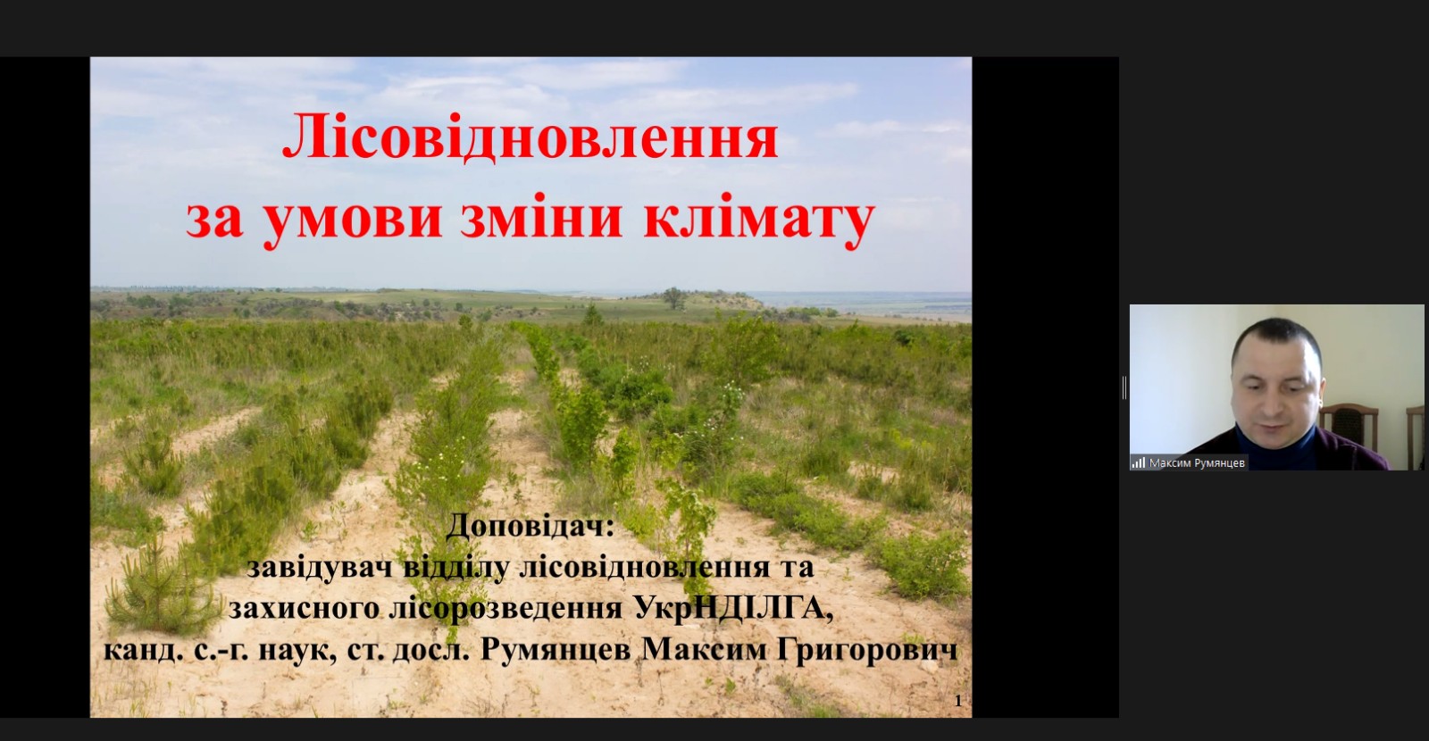 Для здобувачів освітньої програми «Лісове господарство» відбулася гостьова лекція на тему «Лісовідновлення за умови зміни клімату», яку провів завідувач відділу лісовідновлення та захисного лісорозведення УкрНДІЛГА, кандидат сільськогосподарських наук, старший дослідник Максим Григорович Румянцев.