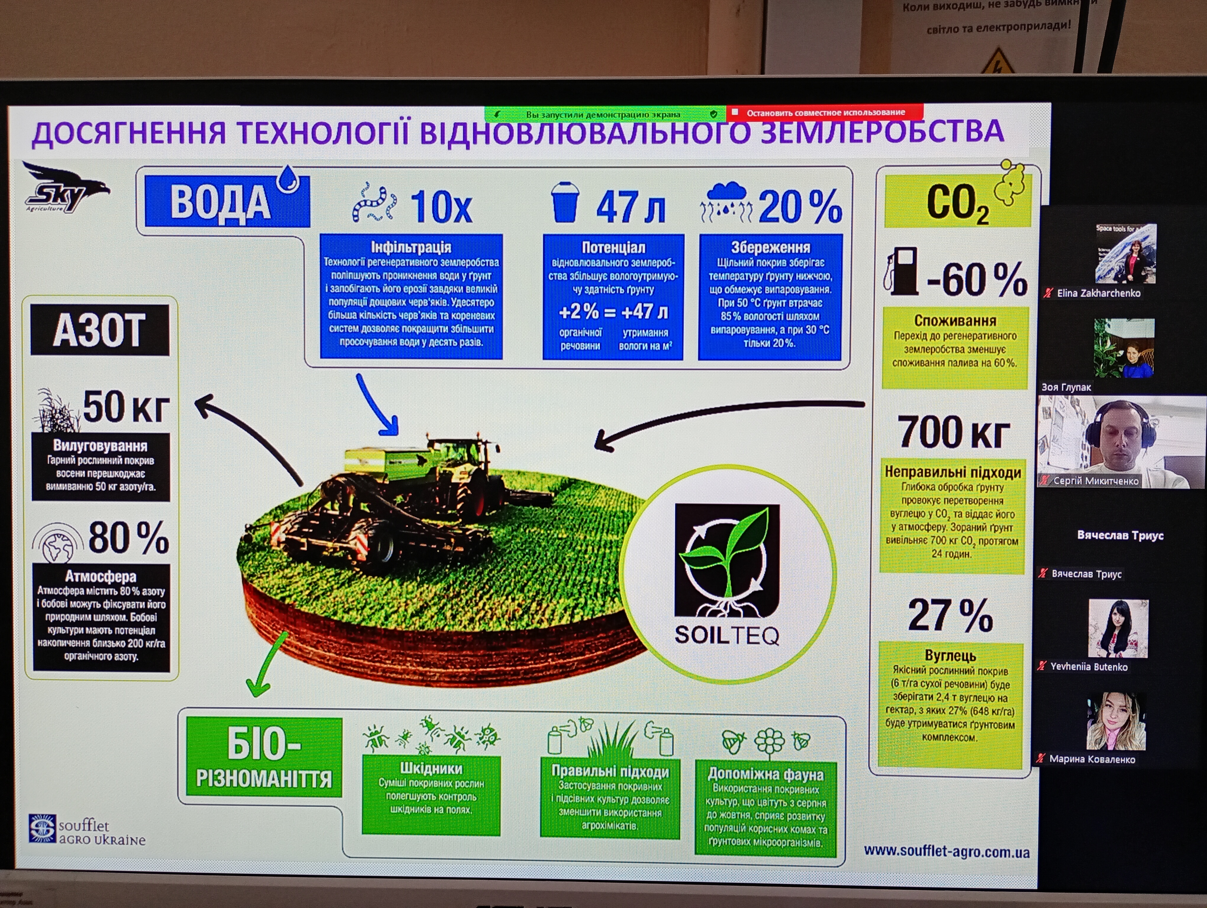 «Зораний ґрунт вивільняє 700 кг/га вуглецю протягом 24 годин, тоді як покривні культури допомагають зберегти його. Зокрема, 6 т сухої речовини збереже 2,4 т/га вуглецю. З яких 27% або 648 кг/га утримується ґрунтовим комплексом», — підсумував Юрій Григорович.