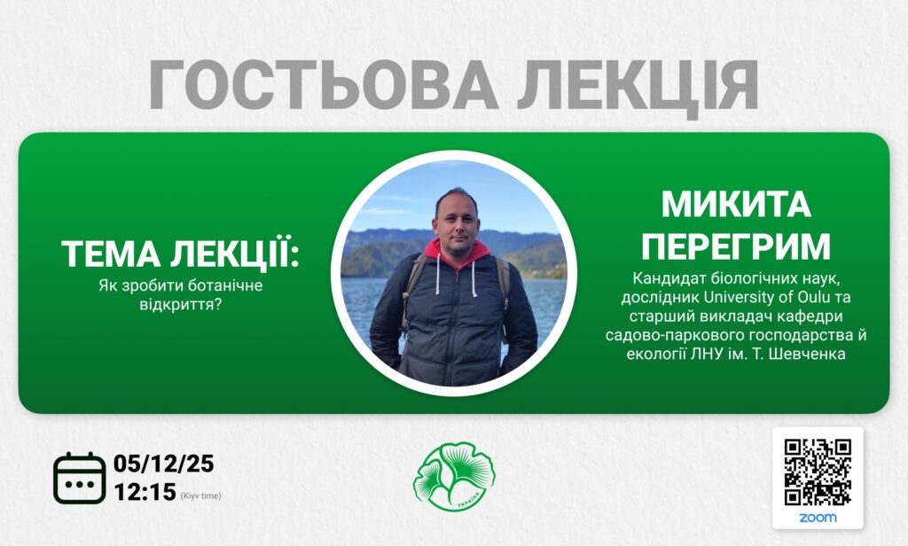 05 грудня 2025 о 12:15 відбудеться гостьова лекція кандидата біологічних наук, дослідника, Ecology and Genetics Research Unit, University of Oulu, Finland і старшого викладача кафедри садово-паркового господарства та екології, Луганського національного університету імені Тараса Шевченка, Микити Перегрима на тему: Як зробити ботанічне відкриття?