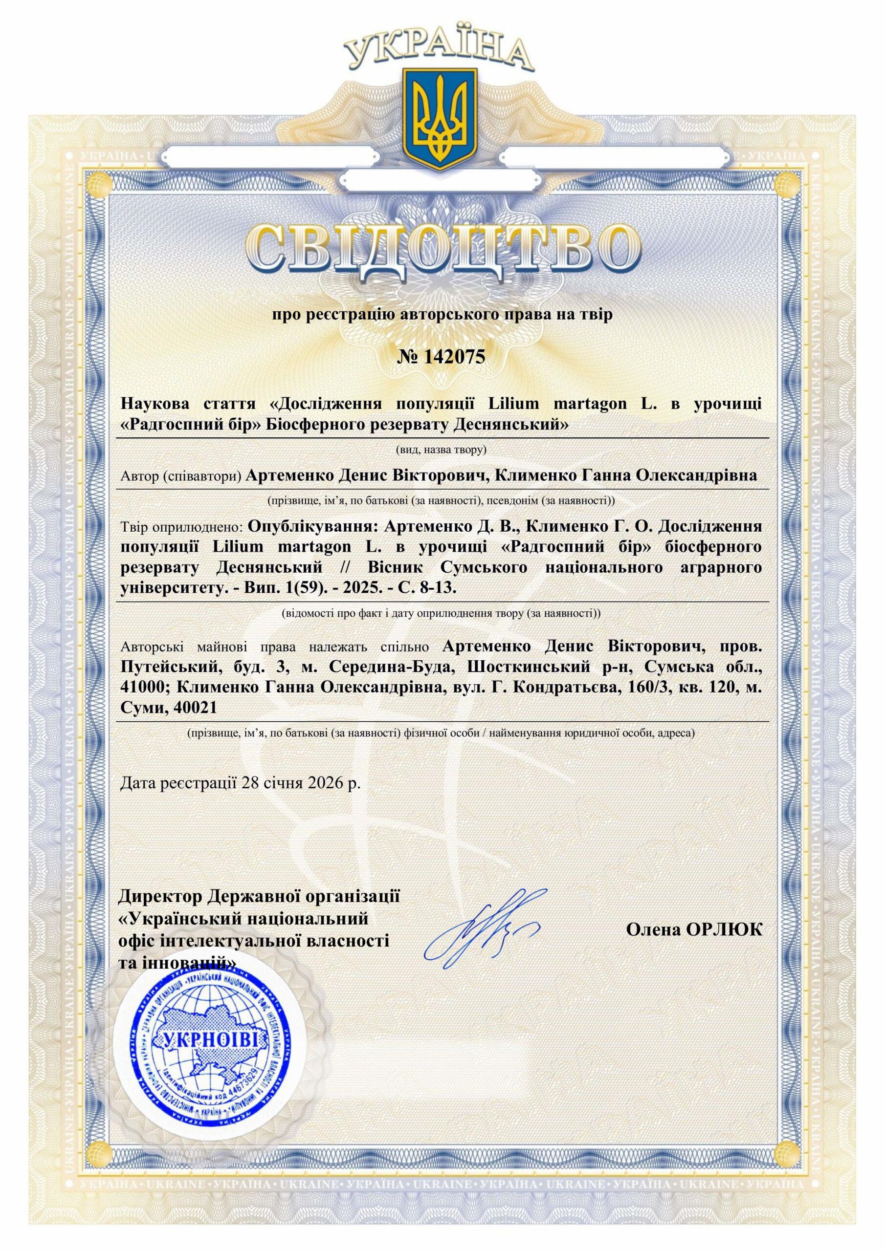Доцент Клименко Ганна та аспірант Артеменко Денис отримали свідоцтво про право власності на твір № 142075 від 28 січня 2026 року на наукову статтю «Дослідження популяції Lilium martagon L. в урочищі «Радгоспний бір» Біосферного резервату “Деснянський”».