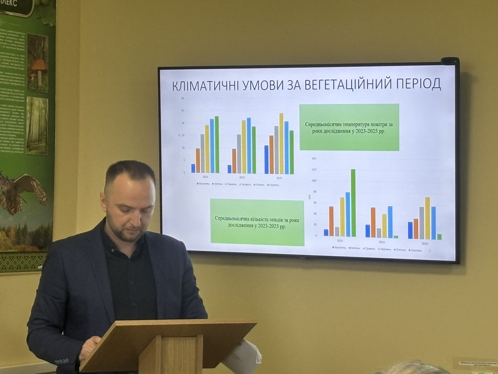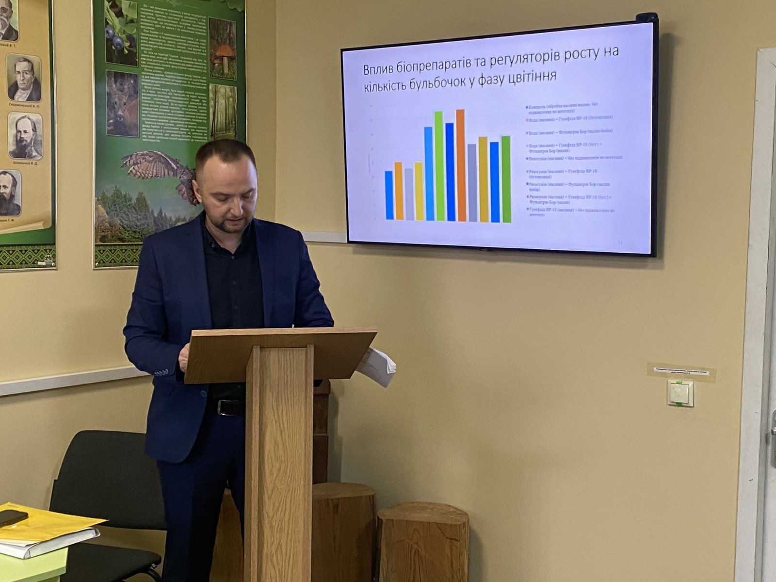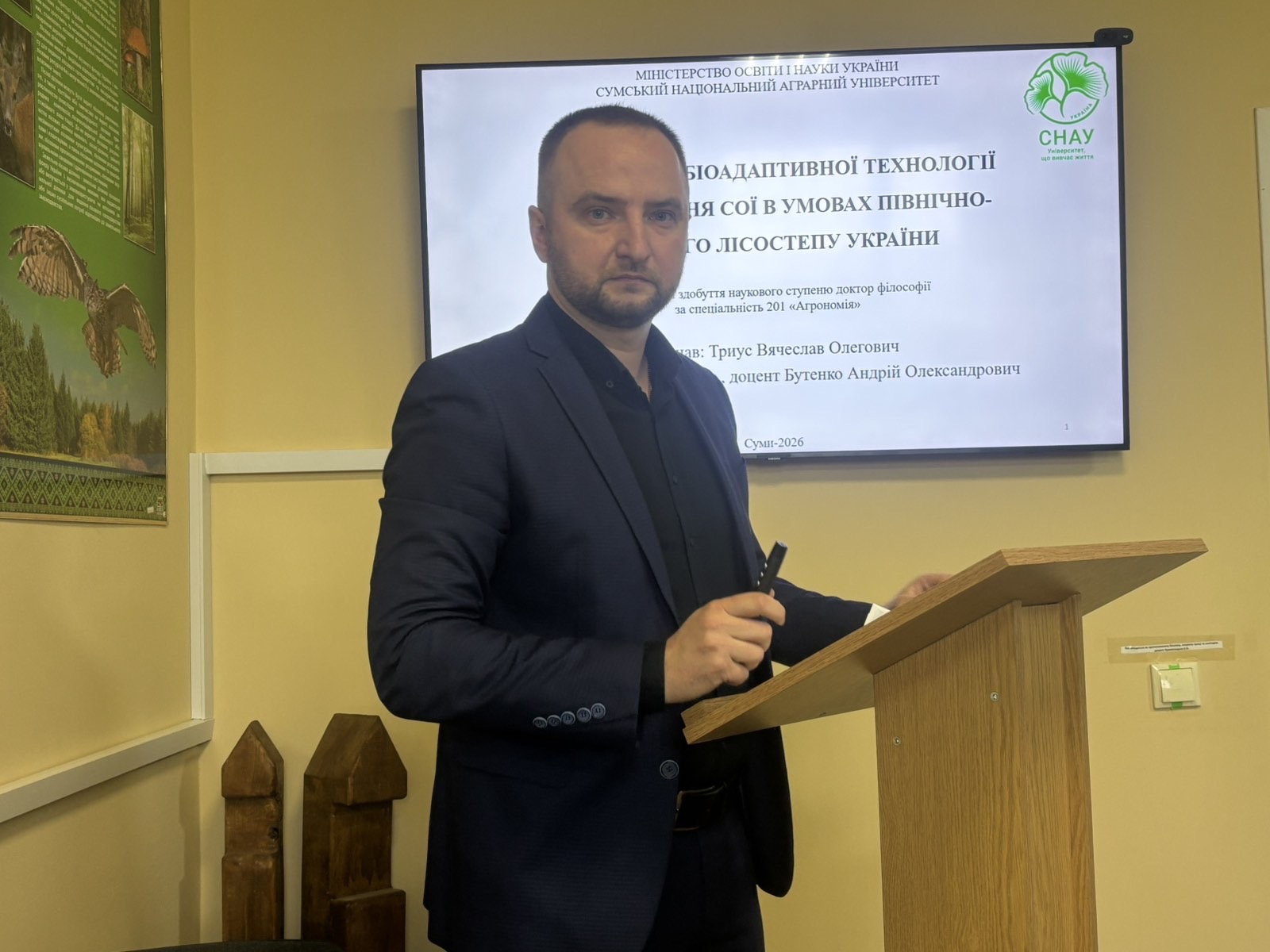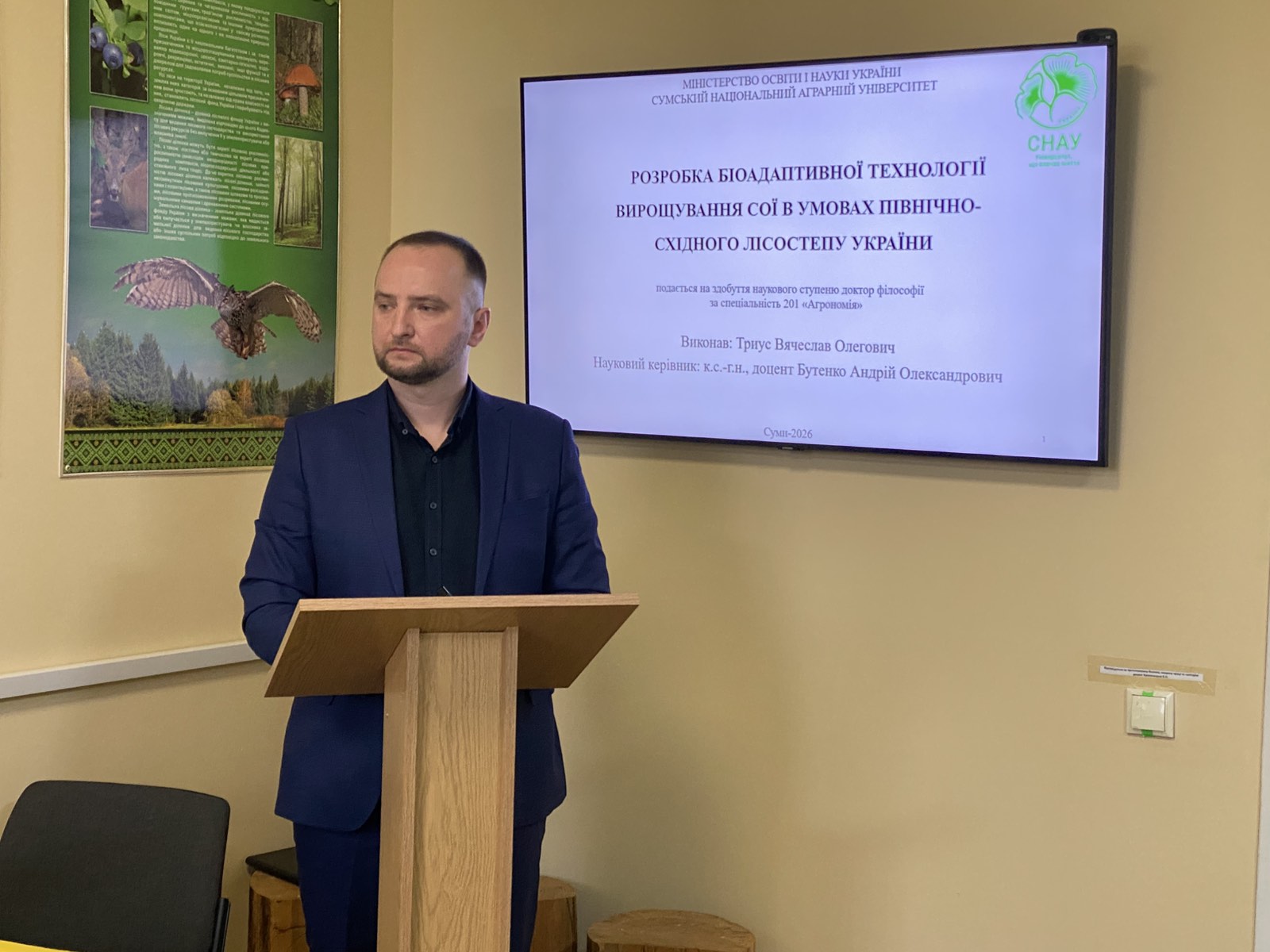 Триус Вячеслав Олегович доповідав за темою: «Розробка біоадаптивної технології вирощування сої в умовах Північно-східного Лісостепу України». Його науковий пошук спрямований на створення стійких та ефективних технологій у сучасному землеробстві. Науковий керівник — кандидат сільськогосподарських наук, доцент кафедри агротехнологій та ґрунтознавства Бутенко Андрій Олександрович.