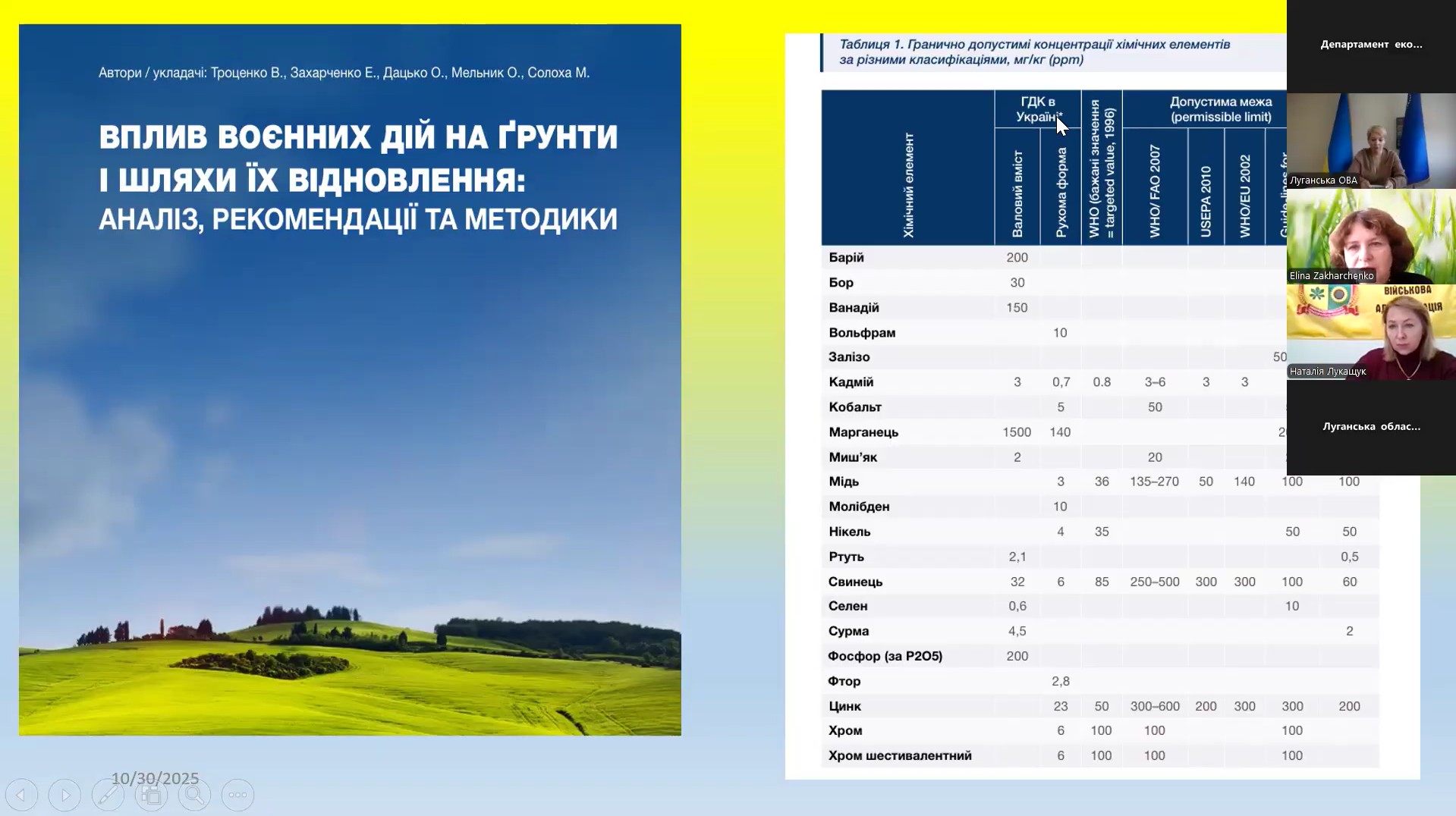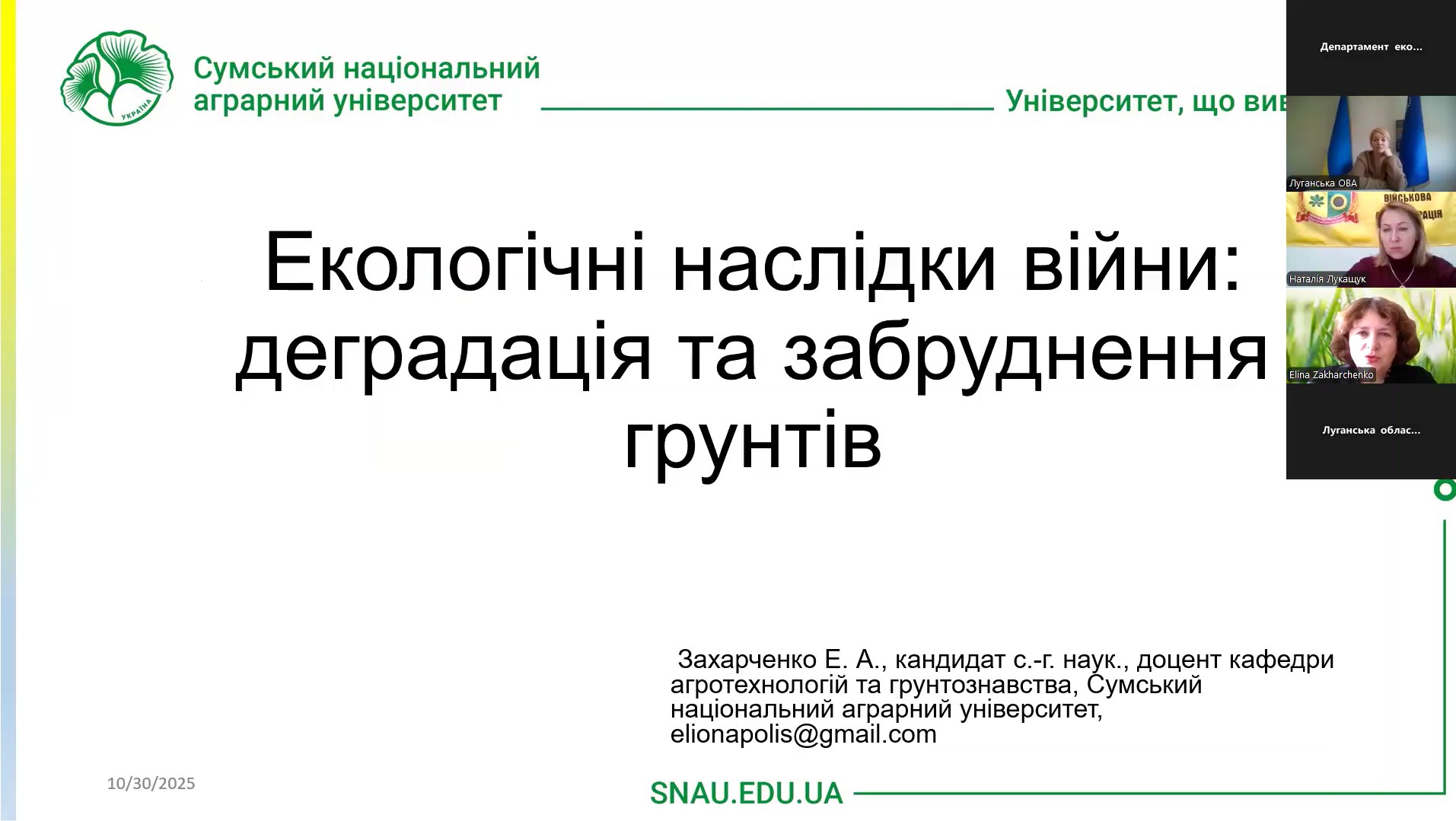 Доцентом кафедри агротехнологій та грунтознавства зроблено доповідь для управлінців та бізнесу Луганської області щодо ситуації на земельних ділянках сільськогосподарського призначення, що постраждали внаслідок бойових дій. Обговорено способи відбору грунтових зразків, попередні результати аналізу, порівняння даних з ГДК важких металів, надані практичні рекомендації щодо рекультивації ушкоджених ділянок. Оцінка рівня ушкодження та забруднення повинна здійснюватися фахівцями, так як далі буде здійснюватися розмір шкоди, що цікавило юристів та економістів.