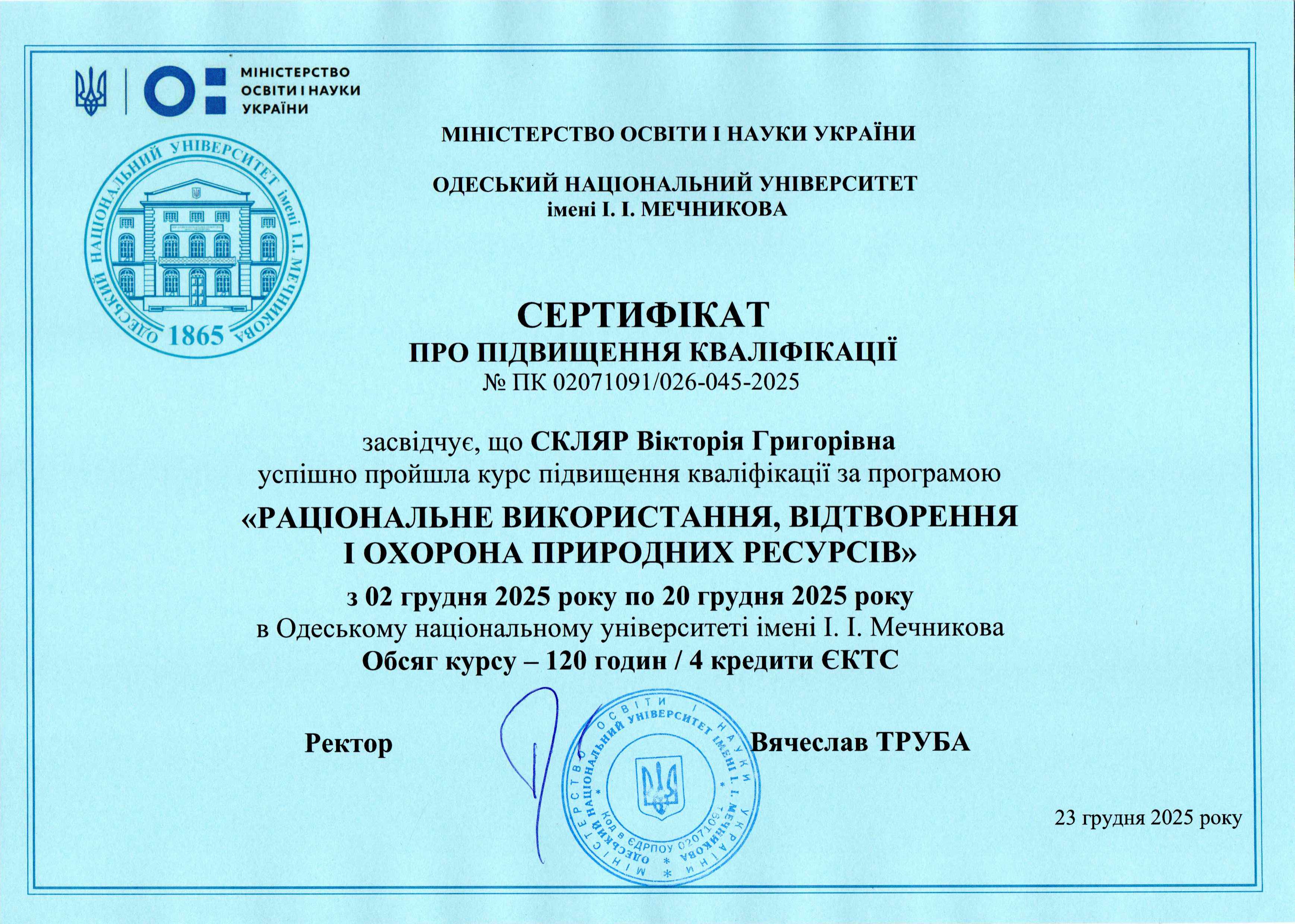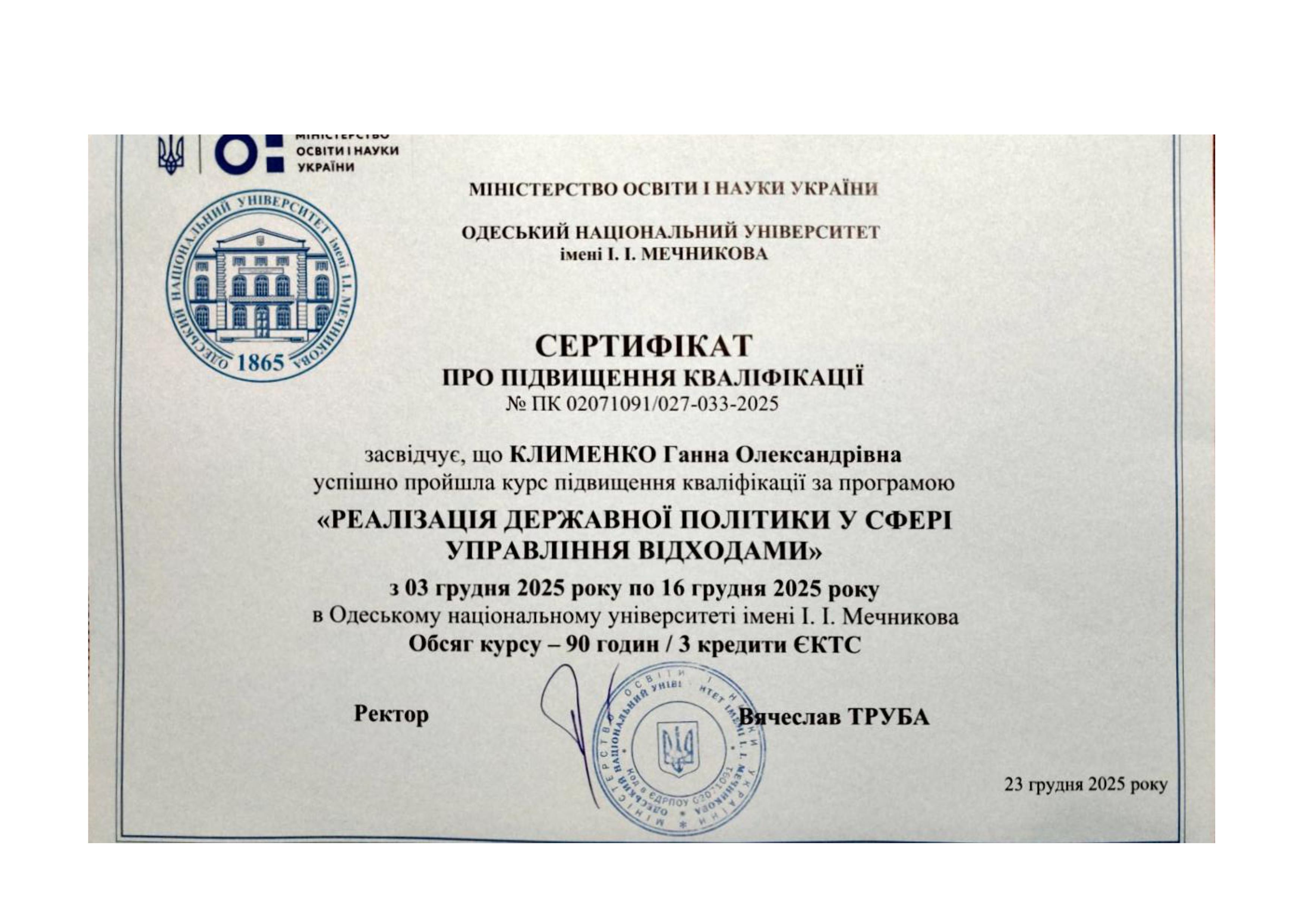 У грудні 2025 року викладачі кафедри екології успішно пройшли підвищення кваліфікації в Одеському національному університеті імені І.І. Мечникова, а саме: