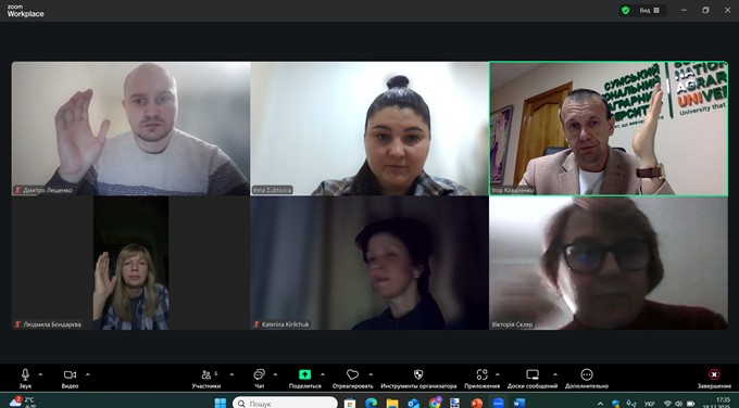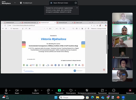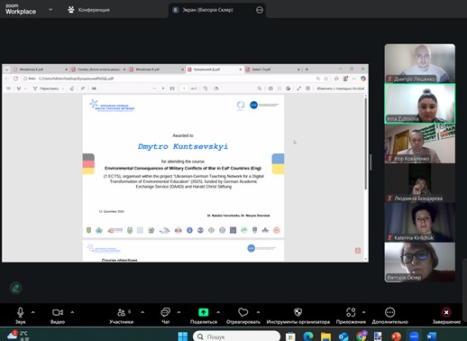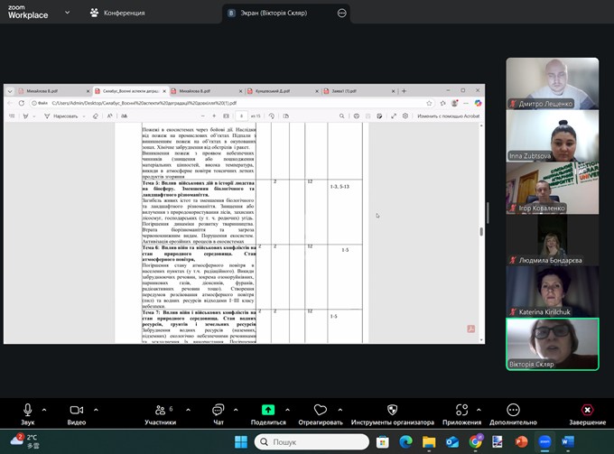 У ході засідання члени проєктної групи здійснили аналіз та обговорення матеріалів, поданих аспірантами Михайловою В. та Кунцевським Д., які пройшли неформальне навчання за дисципліною «Воєнні аспекти деградації довкілля». Було оцінено відповідність набутих результатів навчання програмним результатам освітньо-наукової програми, вимогам чинних нормативних документів та змісту силабусу цієї дисципліни.
