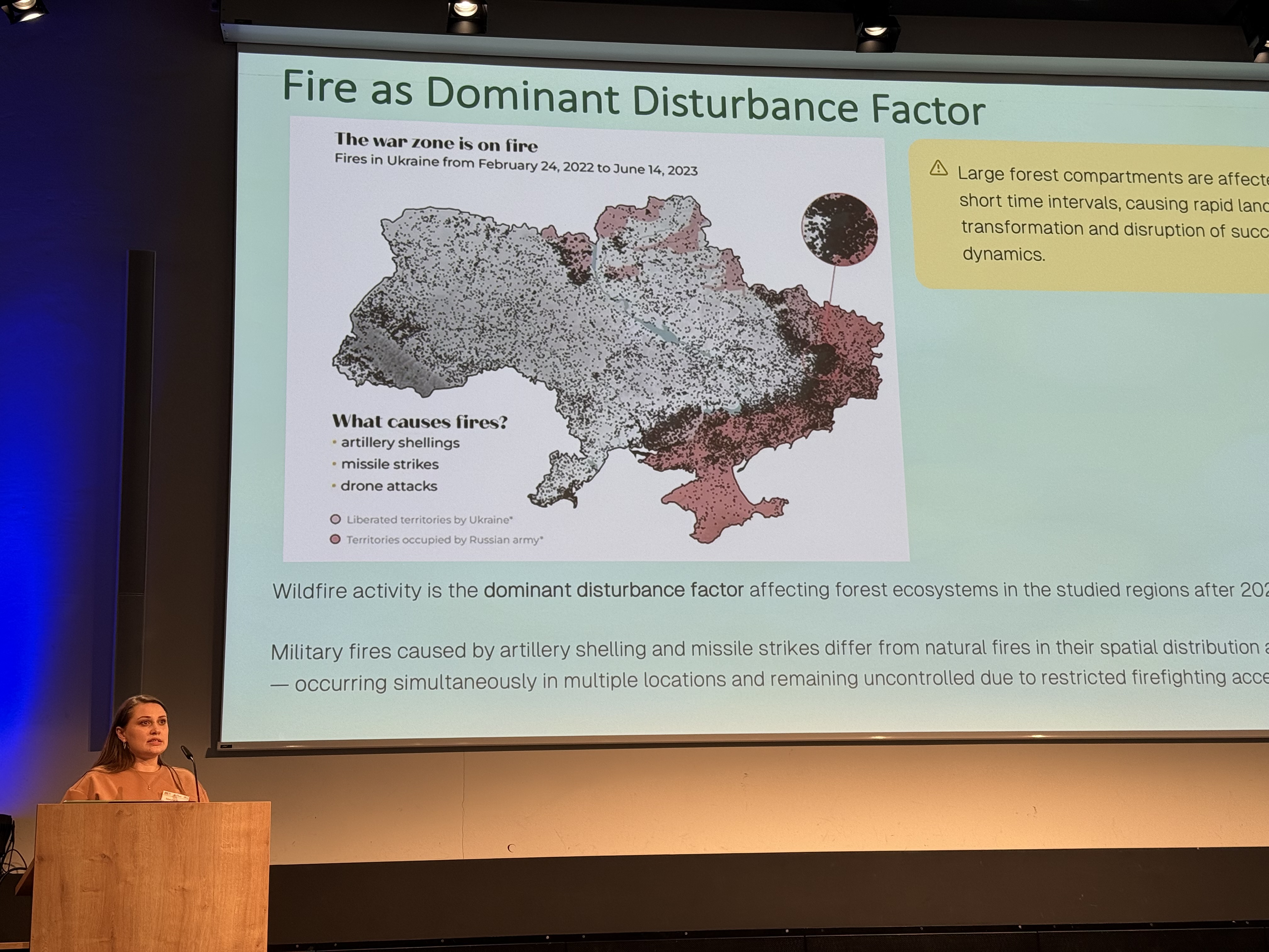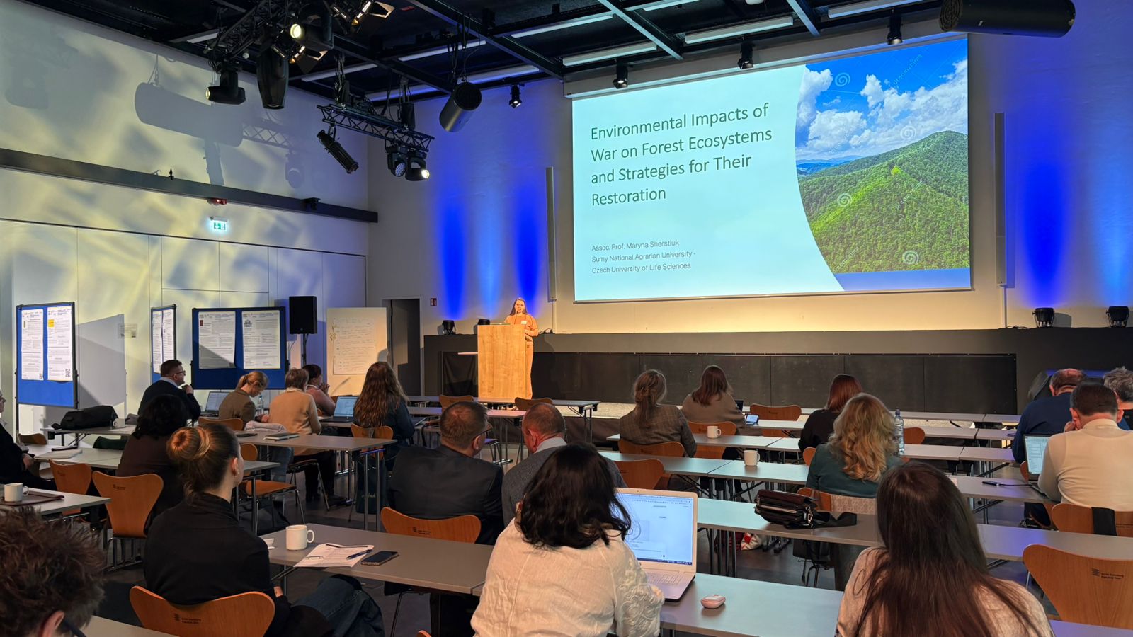 У межах заходу було представлено наукову доповідь «Environmental Impacts of War on Forest Ecosystems and Strategies for Their Restoration», присвячену аналізу впливу воєнних дій на лісові екосистеми України, зокрема пожеж, вибухових пошкоджень, фрагментації середовищ існування та зниження продуктивності рослинності. Окрему увагу приділено використанню супутникового моніторингу для оцінювання екологічних змін і розробці науково обґрунтованих підходів до відновлення лісів у післявоєнний період.