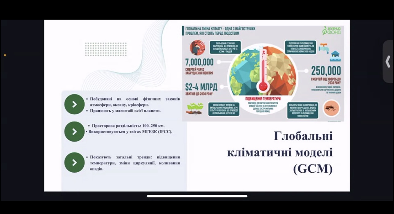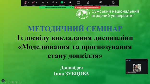 У межах заходу к. б. н., доцент кафедри Зубцова Інна Володимирівна поділилися напрацюваннями щодо застосування новітніх методів екологічного моделювання, використання спеціалізованого програмного забезпечення, а також інтеграції геоінформаційних технологій у навчальний процес. Особливу увагу було зосереджено на формуванні в здобувачів компетентностей, необхідних для аналізу екологічних ризиків, оцінювання сценаріїв розвитку природних систем та прийняття обґрунтованих управлінських рішень.