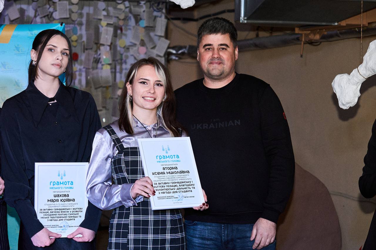 19 листопада в місті Суми, у межах міського проєкту «Від ЗВО до ЗВО», з нагоди Міжнародного дня студента, студентка факультету агротехнологій та природокористування Сумського національного аграрного університету Ксенія Аторіна була нагороджена грамотою міського голови за активну громадянську та життєву позицію, благодійну й волонтерську діяльність.