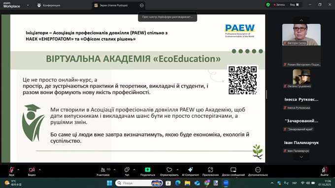 7 жовтня 2025 року викладачі кафедри екології та ботаніки (доценти І.В. Зубцова, Г.О. Клименко, Ю.Л. Скляр та професор В.Г. Скляр) й здобувачі вищої освіти першого-другого рівнів за спеціальністю «Екологія» взяли участь у брифінг-презентації проєкту «EcoEducation» – першої в Україні віртуальної академії екологічної освіти, створеної Асоціацією професіоналів довкілля «ПАЕУ» у партнерстві з НАЕК «Енергоатом» та «Офісом сталих рішень» задля підсилення взаємозв’язку між теорією та практикою в екологічній галузі. Проєкт «EcoEducation» є результатом плідної співпраці юристів, екологів, експертів з ОВД, ESG, енергоефективності та кліматичних ризиків, які щодня впроваджують реформи й адаптують підприємства до європейських стандартів.