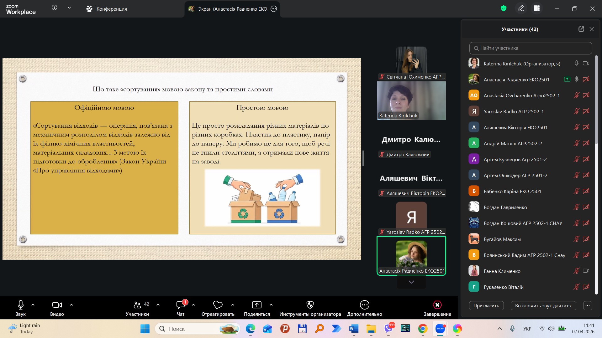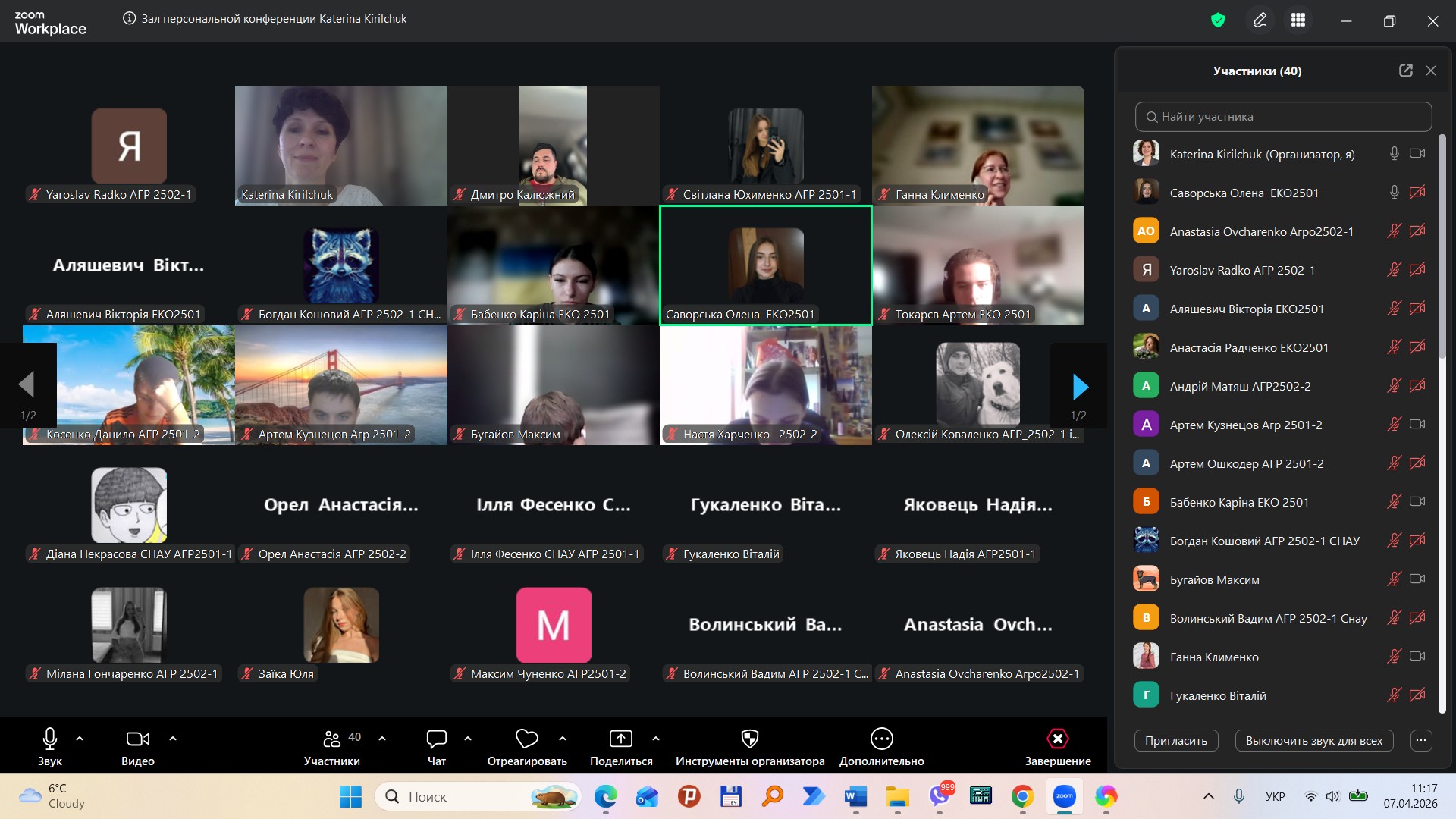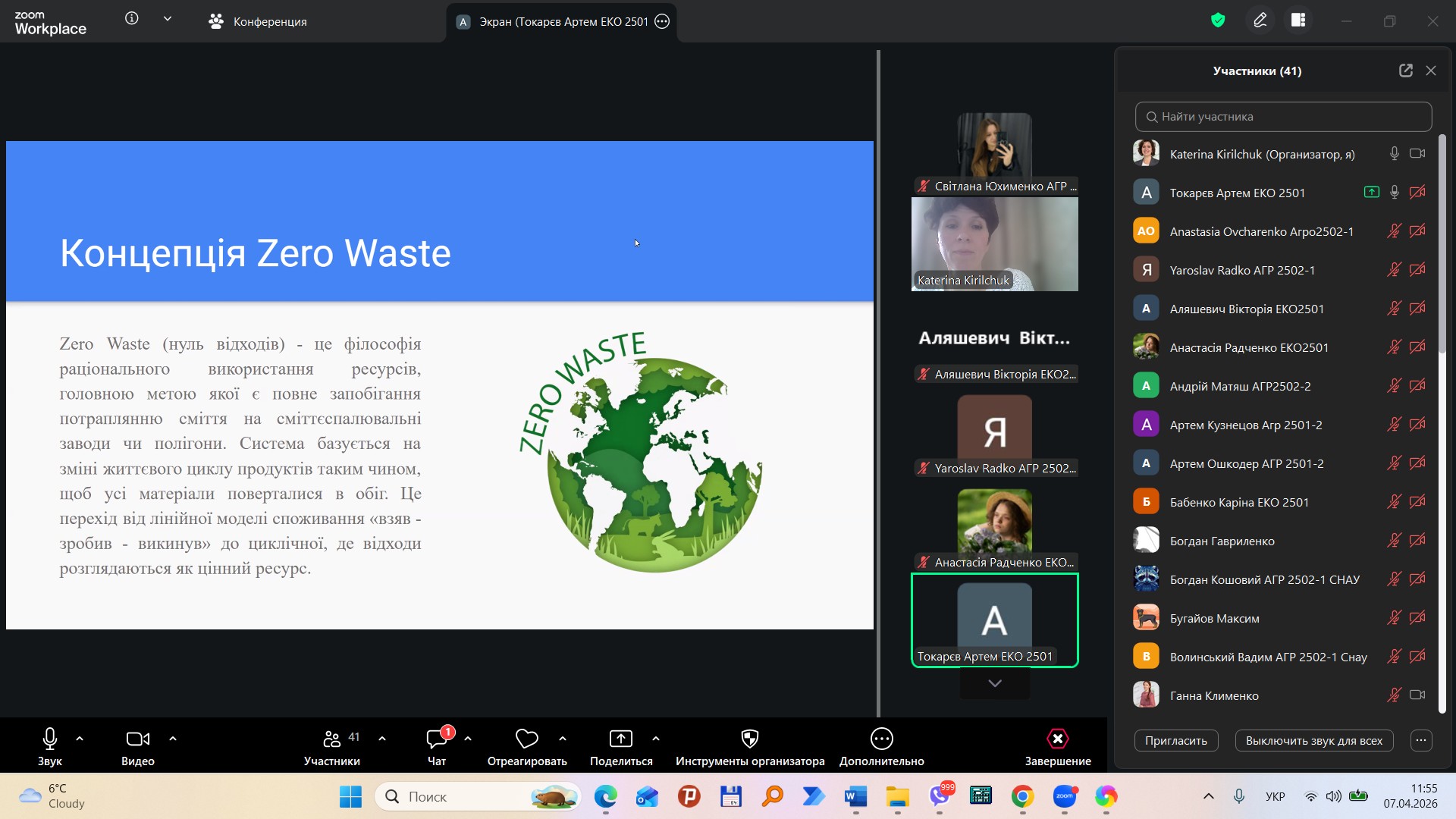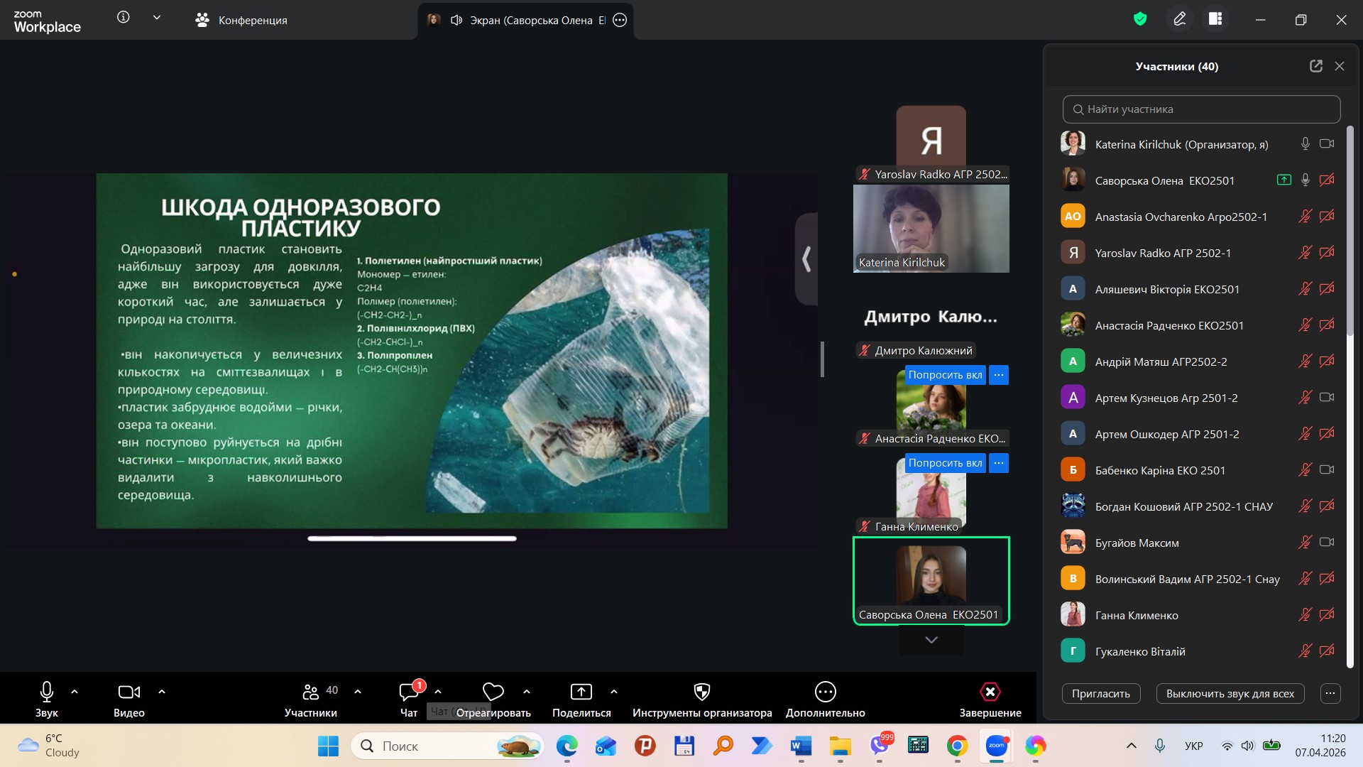 На кафедрі екології та ботаніки відбулося чергове засідання наукового студентського гуртка «Біосфера», присвячене Всесвітньому дню екологічної освіти. У засіданні гуртка взяли участь: к.б.н., доц. К.С. Кирильчук (керівник гуртка) та к.б.н., доц. Г.О. Клименко, а також здобувачі вищої освіти ОС «Бакалавр» спеціальності «Екологія». До засідання студентського наукового гуртка долучилися студенти спеціальності «Агрономія» першого року навчання (в межах викладання дисципліни “Екологія”, ведучий курсу доц. Клименко Г.О.).