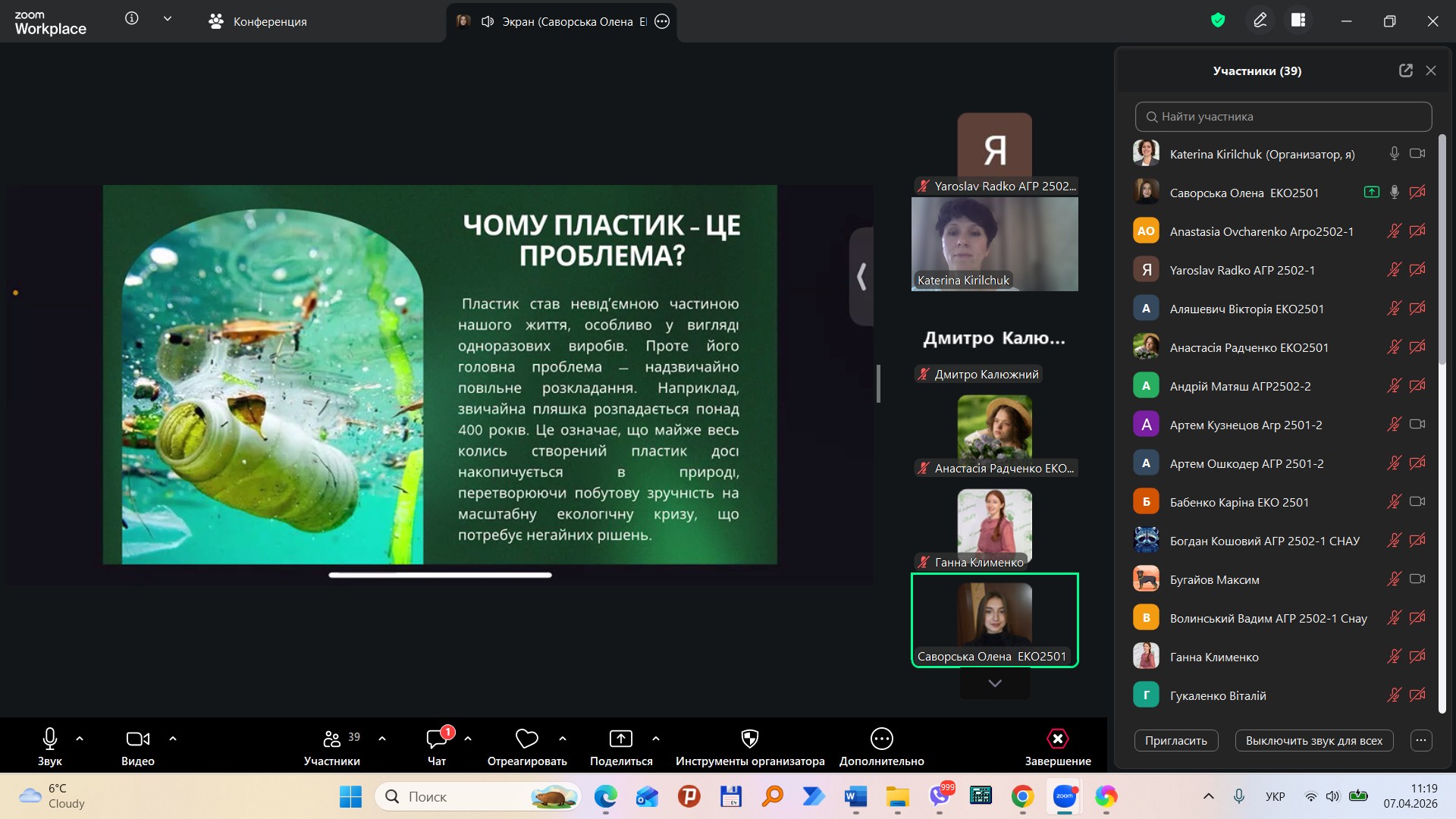 На засіданні було заслухано низку доповідей, підготовлених студентами 1 курсу спеціальності «Екологія»: Алляшевич В., Саворською О., Токарєвим А., Радченко А., Бабенко К. та Бугайовим М. Тематика доповідей стосувалася питань сталого розвитку України та окремих регіонів, екологічної освіти, поводження з відходами, сортування сміття, пошуків альтернативи пластику, можливостям його переробки та збереження біорізноманіття на різних рівнях. Проблематика засідання викликала зацікавленість й активне обговорення студентами питань, озвучених в ході доповідей.