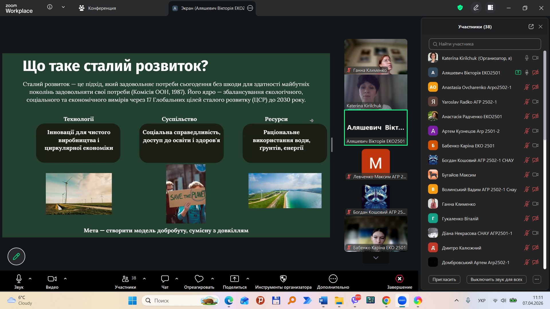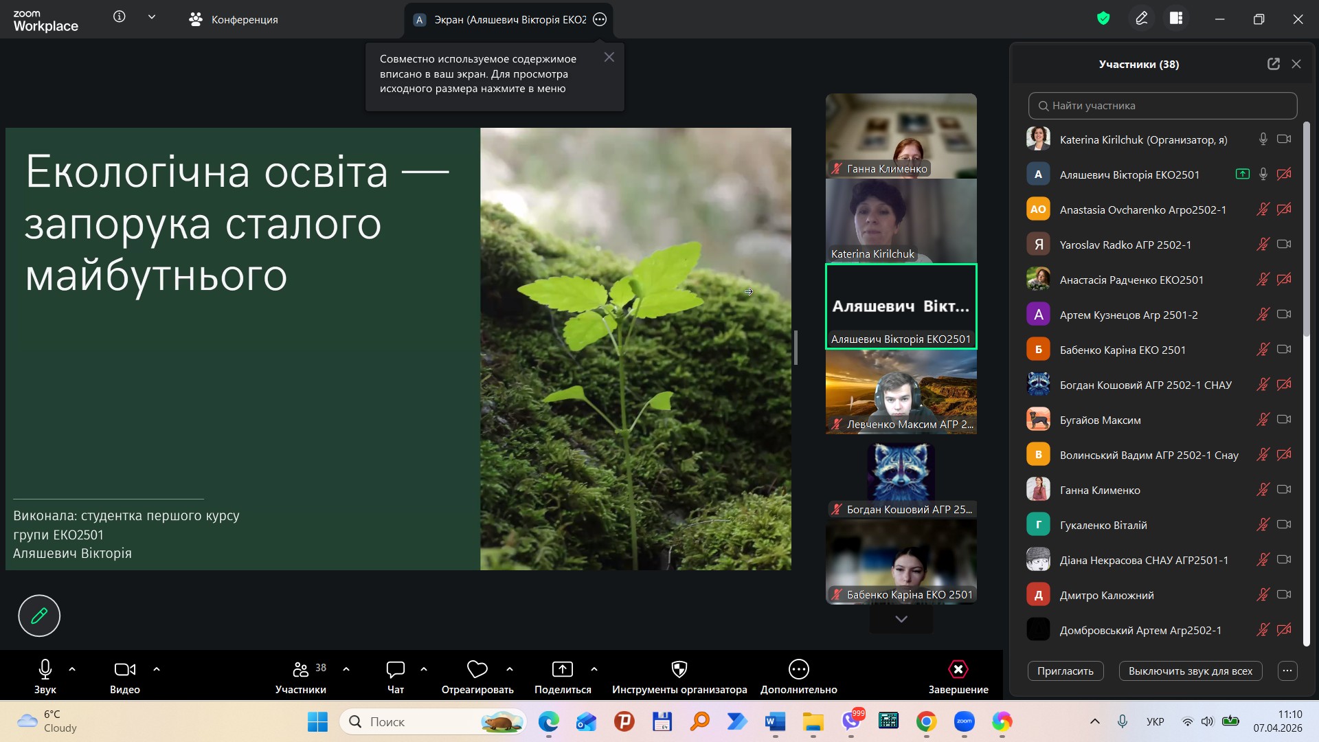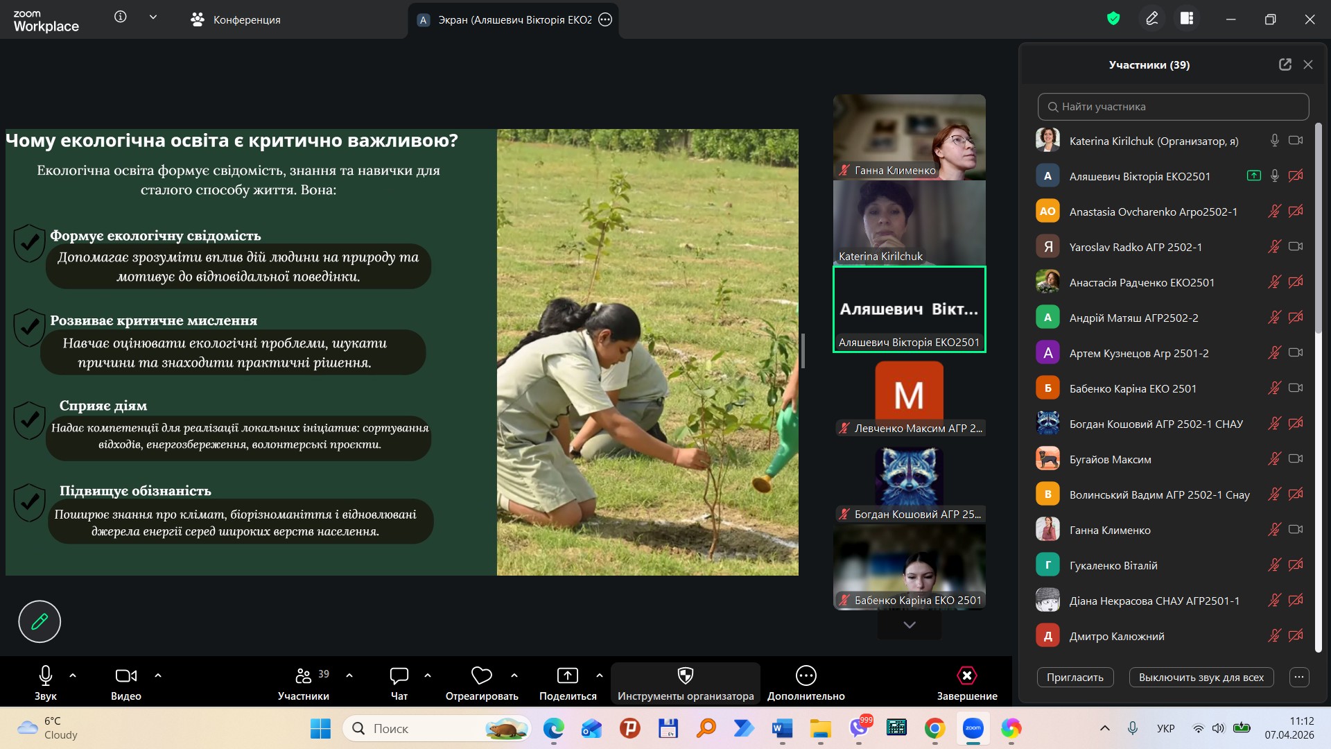 На засіданні студентського наукового гуртка «Біосфера» доцент Клименко Г.О. порушила актуальне питання збереження біорізноманіття в умовах сучасних екологічних викликів, зокрема необхідності відновлення воєнно пошкоджених сільськогосподарських земель України. У доповіді було акцентовано увагу на потенціалі агролісівництва як ефективного інструменту відновлення ґрунтів, підвищення екологічної стійкості агроландшафтів та збереження біотичного різноманіття. Запропоновано розглядати впровадження практичних агролісомеліоративних рішень як один із ключових напрямів післявоєнної екологічної реабілітації територій.