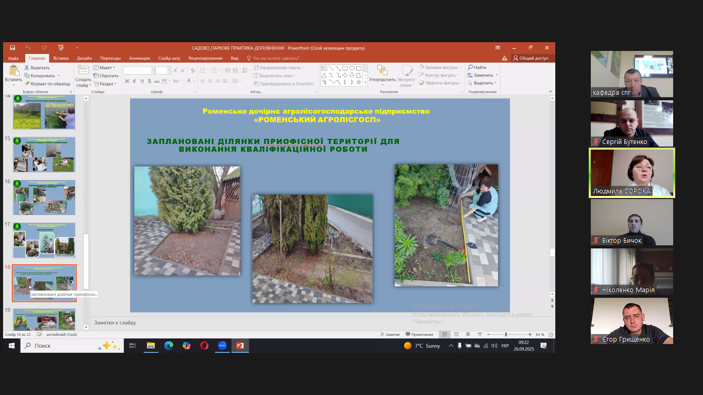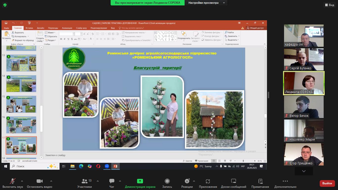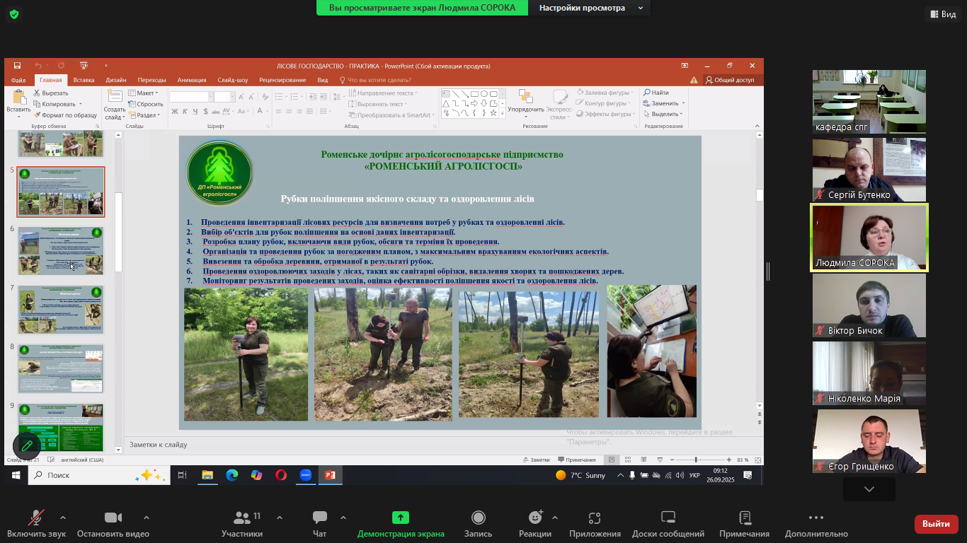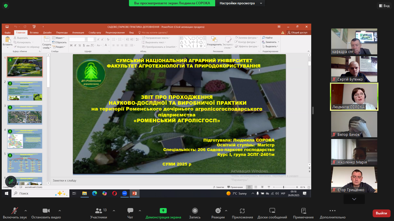 26 вересня 2025 року на кафедрі садово-паркового та лісового господарства відбувся успішний захист виробничої практики студентами заочної форми навчання. Захід охопив як бакалаврів, так і магістрів обох спеціальностей, продемонструвавши єдиний підхід до контролю якості практичної підготовки.