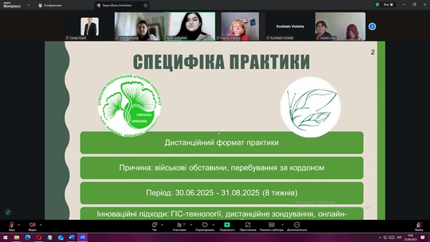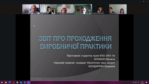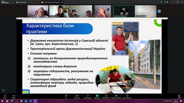 У процесі захисту здобувачі презентували результати виконання індивідуальних завдань, окреслили спектр набутого практичного досвіду, продемонстрували навички роботи з сучасними методами екологічних досліджень, аналізу й інтерпретації даних. Значна увага приділялася питанням застосування інноваційних методик моніторингу довкілля, використанню геоінформаційних технологій, оцінці стану екосистем та апробації методів біоіндикації.