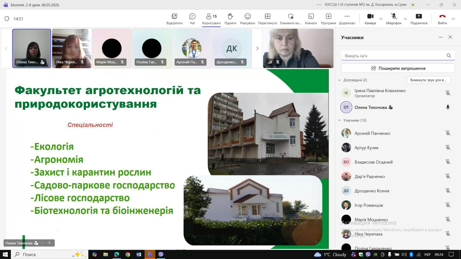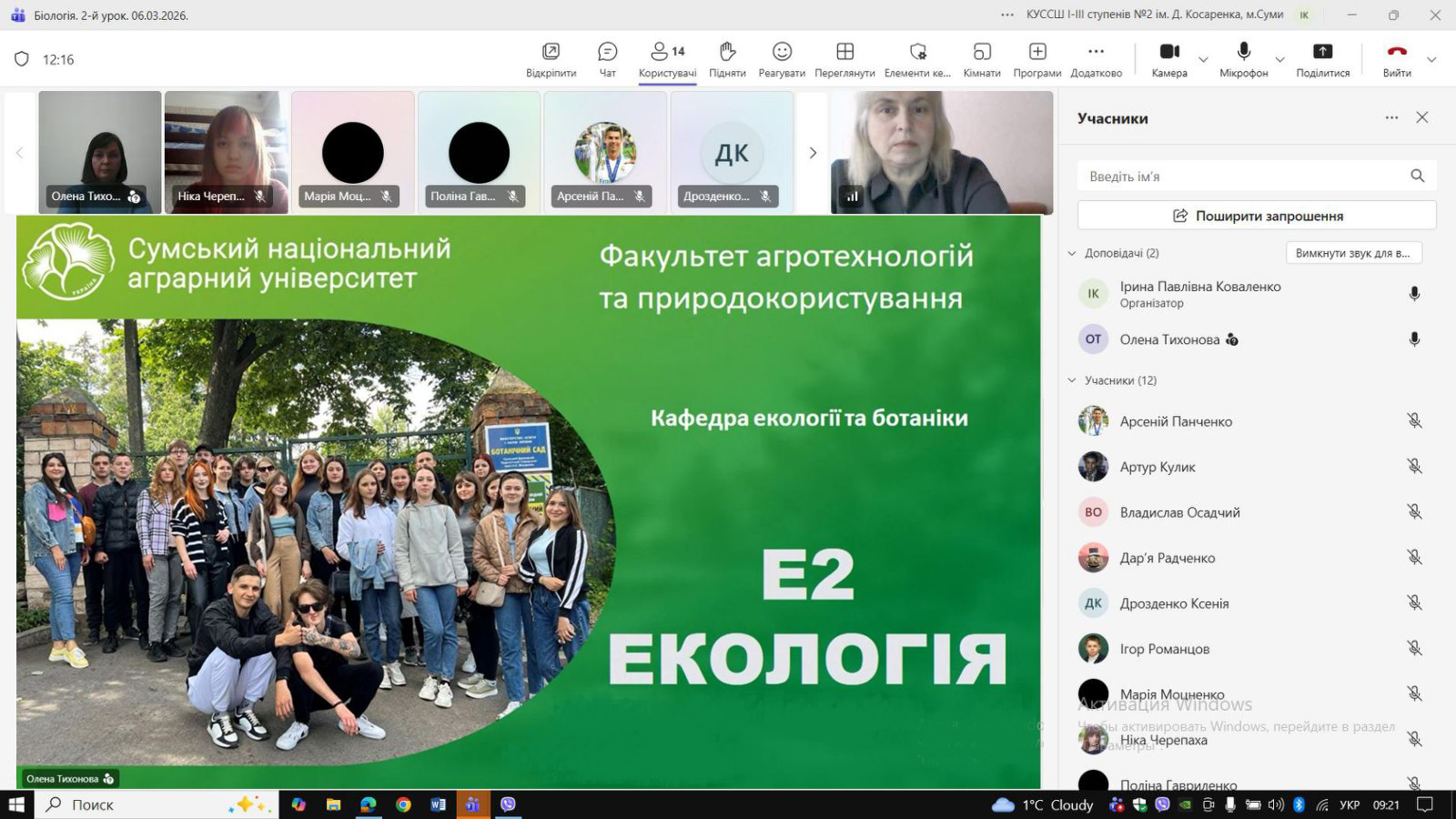 6 березня 2026 р. проведено зустріч з школярами 11 класу Сумського закладу середньої освіти І-ІІІ ступенів №2 Сумської міської ради. Доцент кафедри екології та ботаніки Олена Тихонова представила майбутнім абітурієнтам спеціальності факультету агротехнологій та природокористування та детально розкрила переваги навчання в СНАУ на ОП «Екологія», яка реалізується на трьох рівнях вищої освіти адже професія еколога є суспільно значущою та перспективною. Окрім того, майбутніх абітурієнтів ознайомлено з особливостями вступної кампанії 2026 року. Профорієнтаційна бесіда була спрямована на підготовку учнів до свідомого вибору професії з врахуванням їх здібностей і потреб ринку праці.