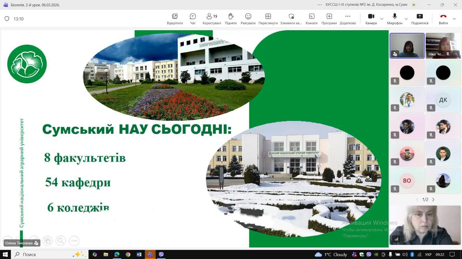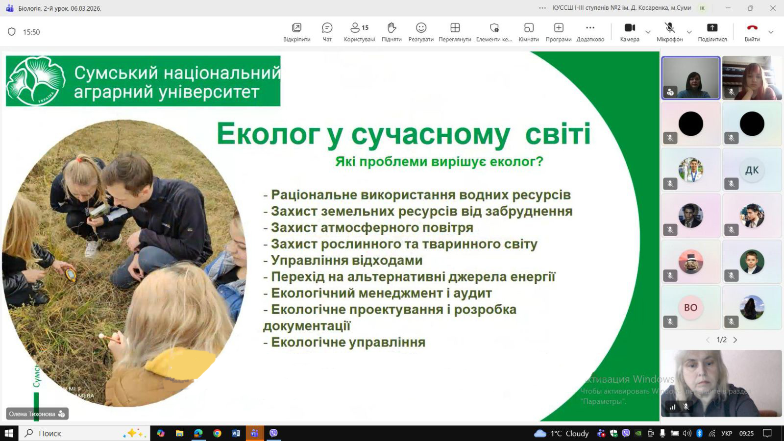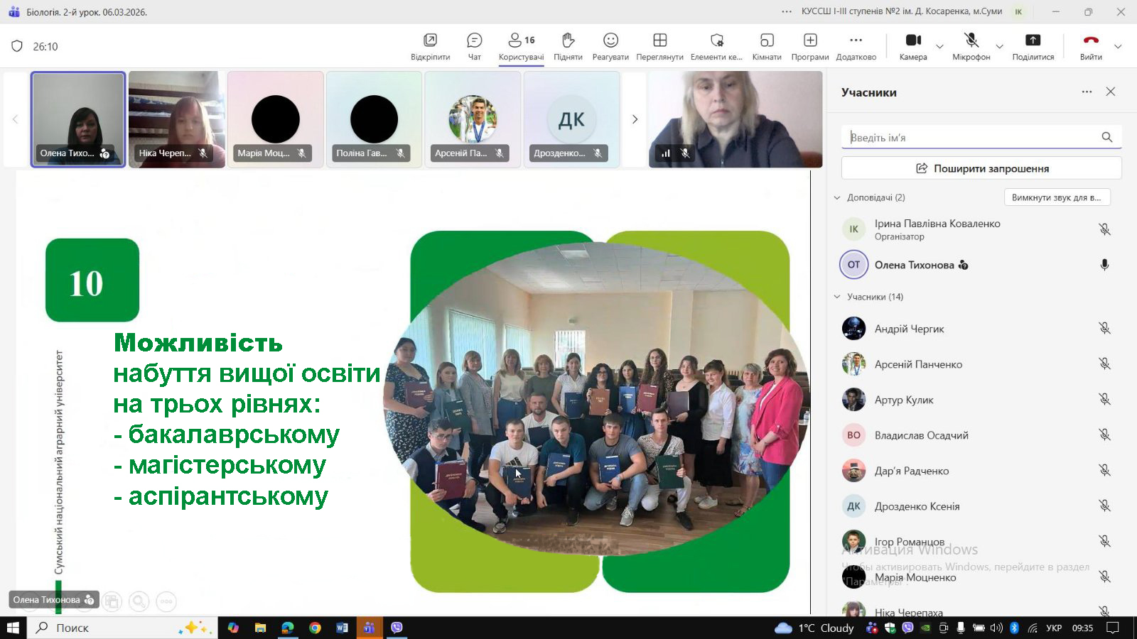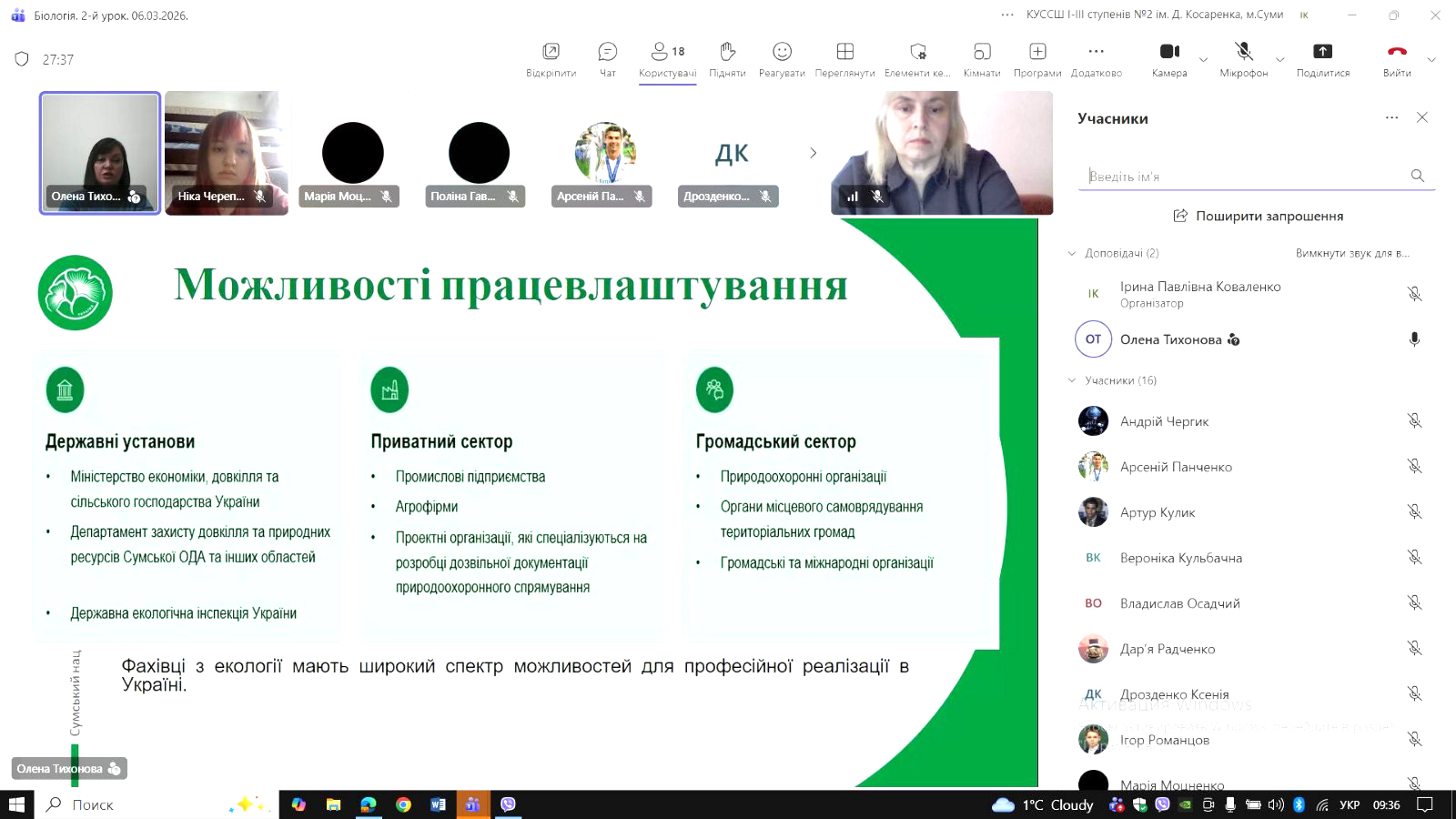6 березня 2026 р. проведено зустріч з школярами 11 класу Сумського закладу середньої освіти І-ІІІ ступенів №2 Сумської міської ради. Доцент кафедри екології та ботаніки Олена Тихонова представила майбутнім абітурієнтам спеціальності факультету агротехнологій та природокористування та детально розкрила переваги навчання в СНАУ на ОП «Екологія», яка реалізується на трьох рівнях вищої освіти адже професія еколога є суспільно значущою та перспективною. Окрім того, майбутніх абітурієнтів ознайомлено з особливостями вступної кампанії 2026 року. Профорієнтаційна бесіда була спрямована на підготовку учнів до свідомого вибору професії з врахуванням їх здібностей і потреб ринку праці.