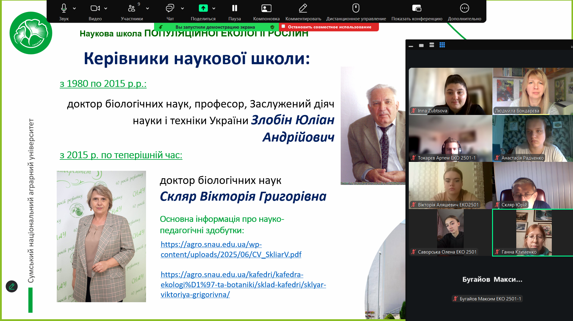 Завідувач кафедри екології Інна Зубцова представила основні напрями наукової діяльності колективу, звернувши увагу на актуальні екологічні дослідження, що здійснюються на кафедрі та презентувала Наукову школу популяційної екології рослин. Викладачі запросили студентів долучатися до наукових гуртків, дослідницьких проєктів і заходів екологічного спрямування.